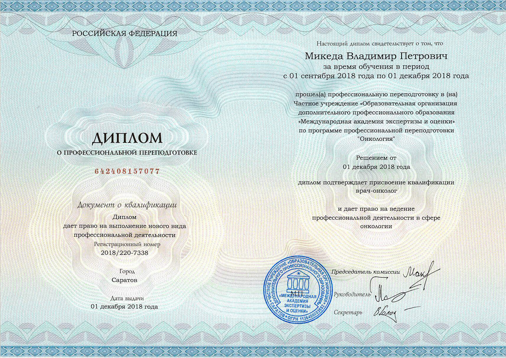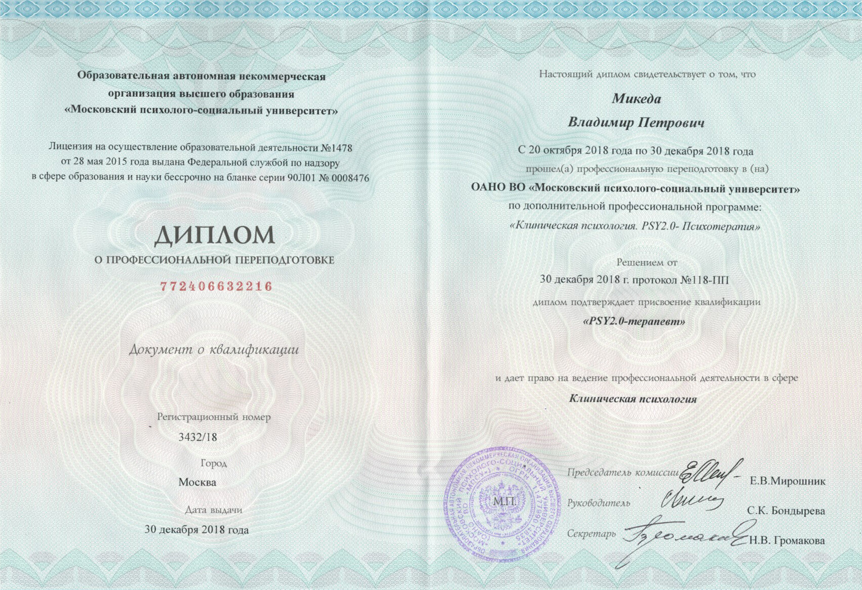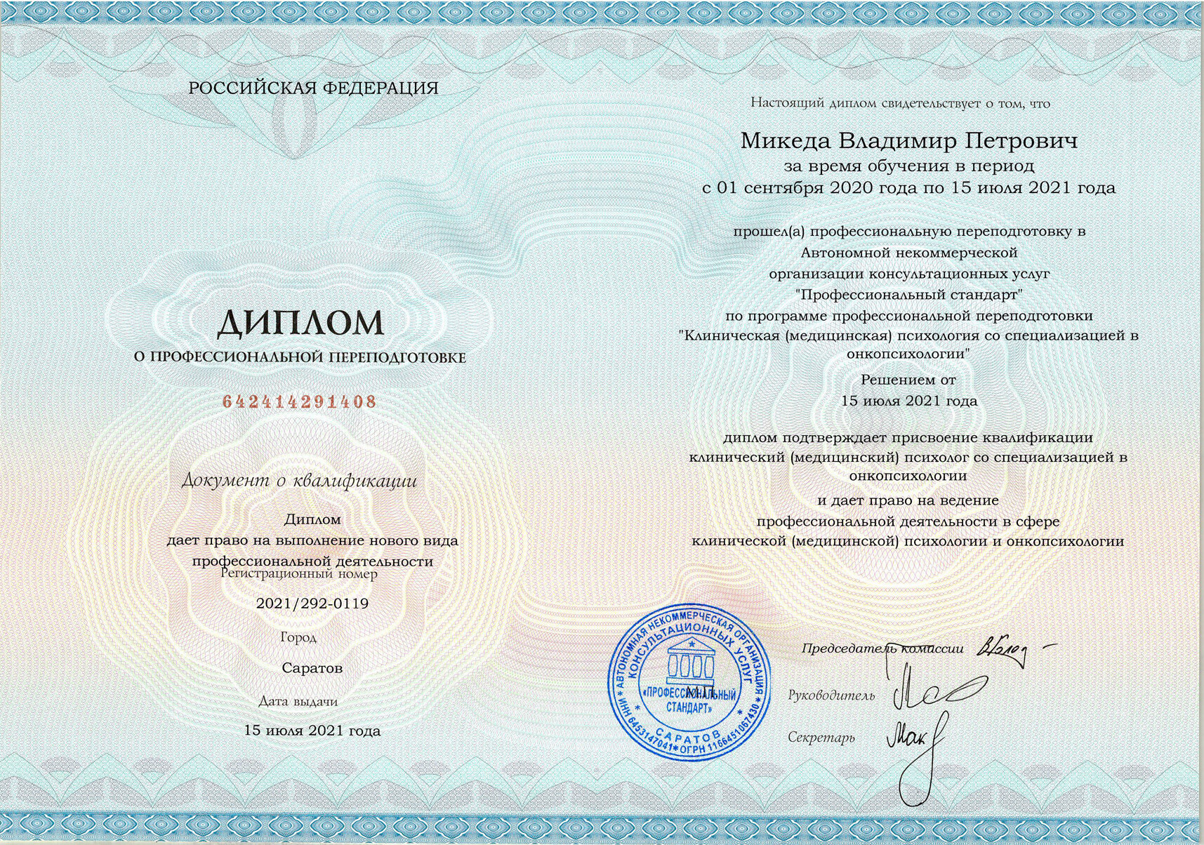 «Диплом о профессиональной переподготовке и присвоении квалификации клинический психолог со специализацией в онкопсихологии» и д. р.