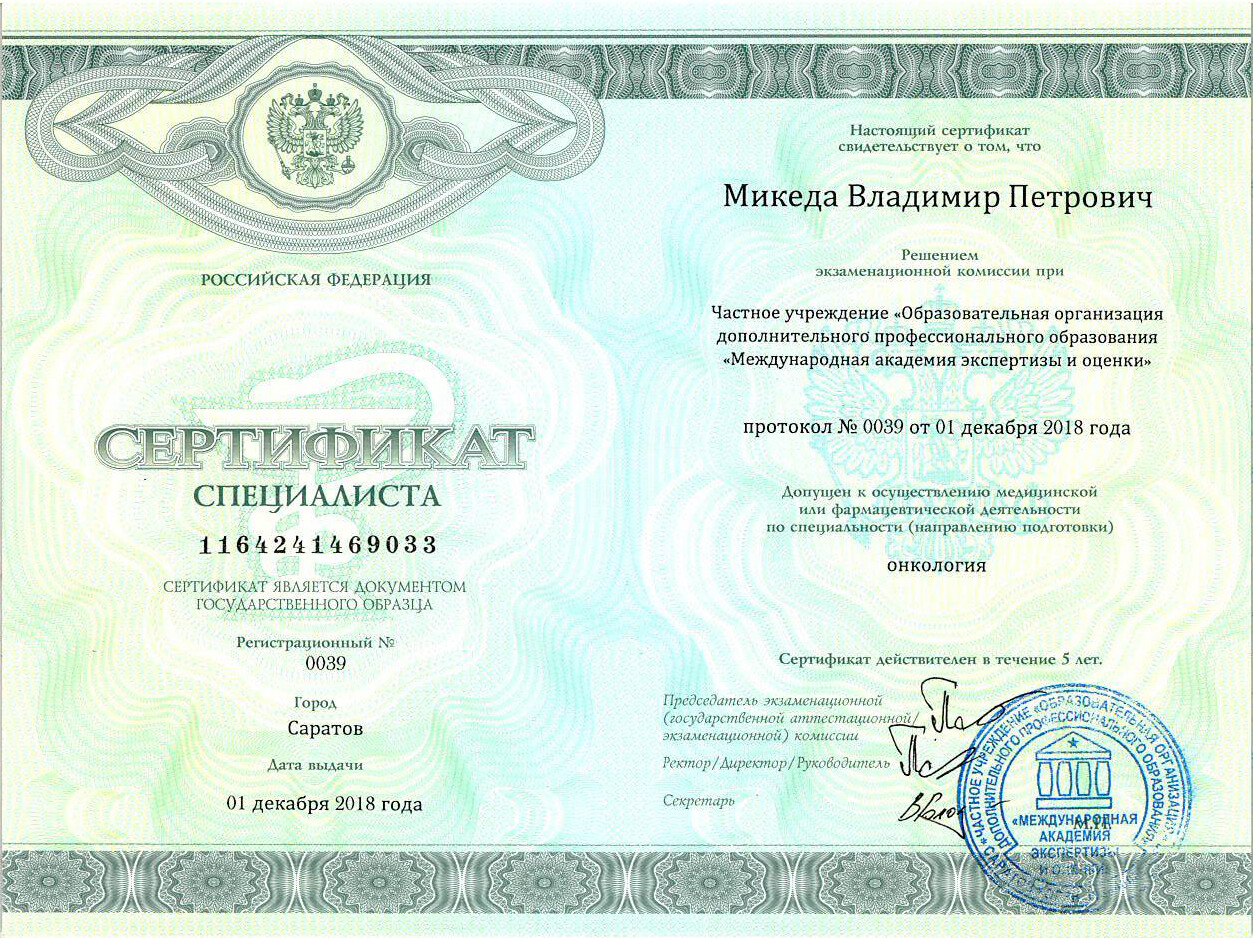 «Сертификат специалиста к осуществлению медицинской или фармацевтической деятельности по специальности Онкология»,