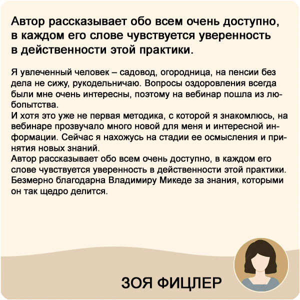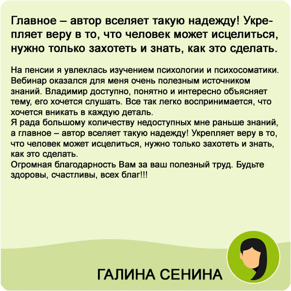 «Вебинар прослушала с удовольствием, весь материал изложен простым для новичков и простых людей языком. Особенно признательна за инсайт, полученный в ходе лекции: я сама могу исправить свое здоровье с помощью этой методики».