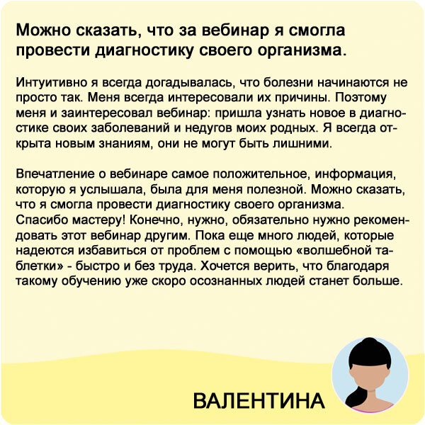 «Впечатление о вебинаре самое положительное, информация, которую я услышала, была для меня полезной, Можно сказать. я смогла провести диагностику своего организма».