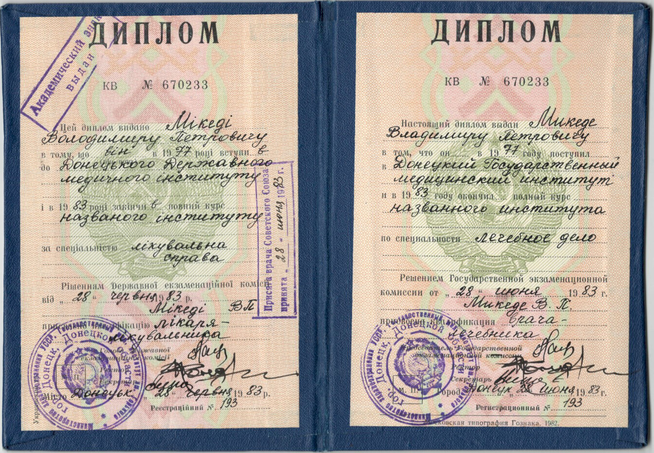 «Диплом об окончании Донецкого медицинского института им. Горького»,
