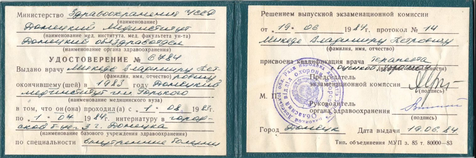 «Диплом об окончании Донецкого медицинского института им. Горького»,