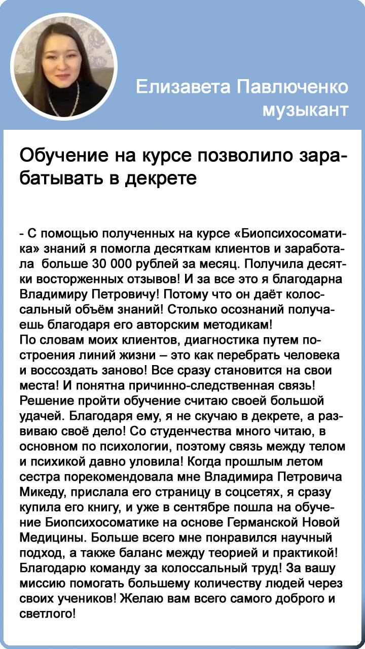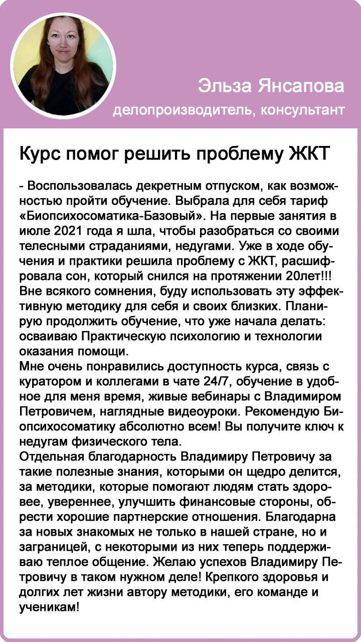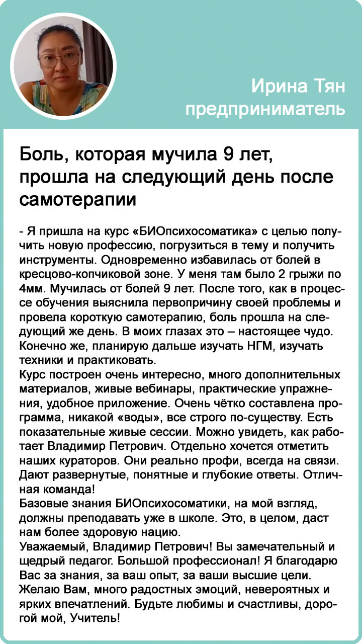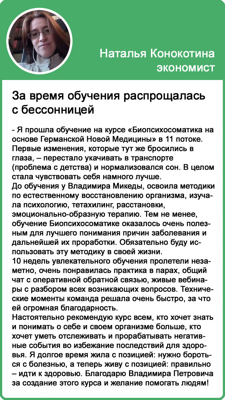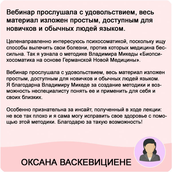 «Вебинар прослушала с удовольствием, весь материал изложен простым для новичков и простых людей языком. Особенно признательна за инсайт, полученный в ходе лекции: я сама могу исправить свое здоровье с помощью этой методики».