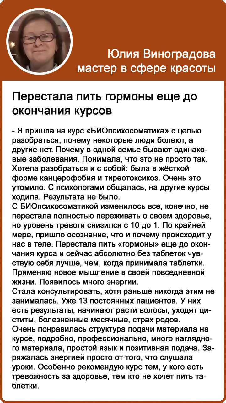 «Впечатление о вебинаре самое положительное, информация, которую я услышала, была для меня полезной, Можно сказать. я смогла провести диагностику своего организма».