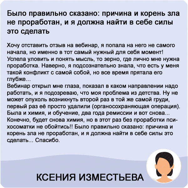«Вебинар открыл мне глаза, показал, в каком направлении надо работать, я подозреваю. что моя проблема из детства».